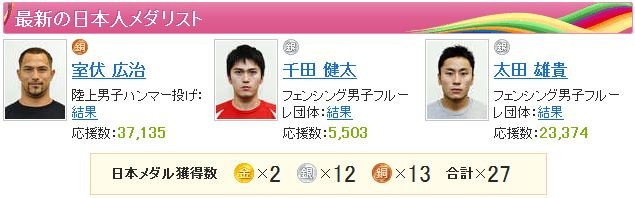 667 名前:名無しさん@実況で競馬板アウト[sage] 投稿日:2012/08/06(月) 06:11:13.03 ID:bs+st50x0日本の獲得メダル数 2-12-13なかなか準オープンに上がれない