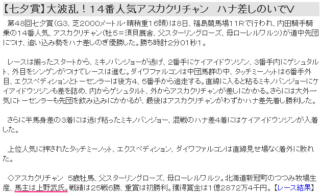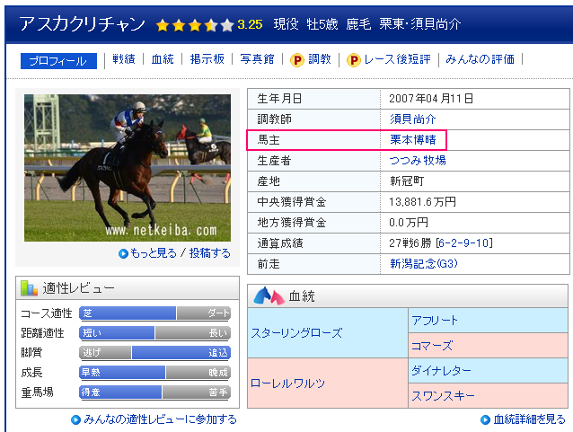 1 :名無しさん@実況で競馬板アウト 2012/10/04(木) 01:50:59.27 ID:JQBMC/1K0 上野武(所有馬:アスカトップレディ) →栗本博晴(クリノの冠名を使用・所有馬にキボウダクリチャンなど) なんでこうなった http://db.netkeiba.com/horse/2007104599/ ※七夕賞記事http://www.sponichi.co.jp/gamble/news/2012/07/08/kiji/K20120708003636230.html 続きを読む